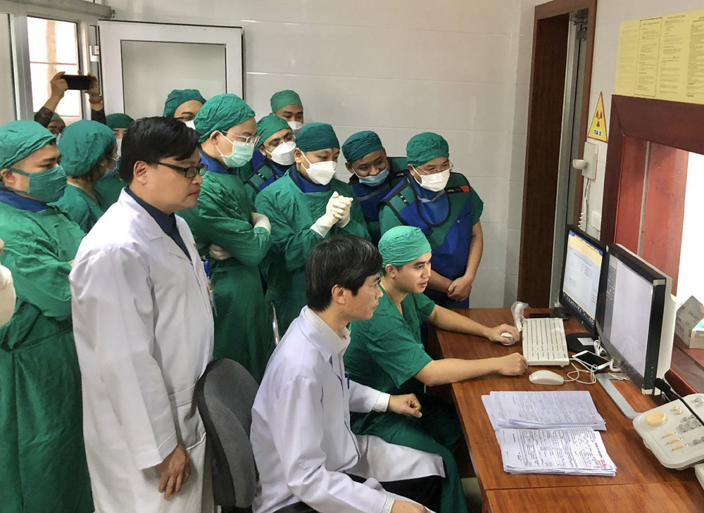 Theo dõi thao tác thực hiện trong chuyển giao kỹ thuật tại BVĐK Hà Tĩnh. Ảnh: BVTW Huế