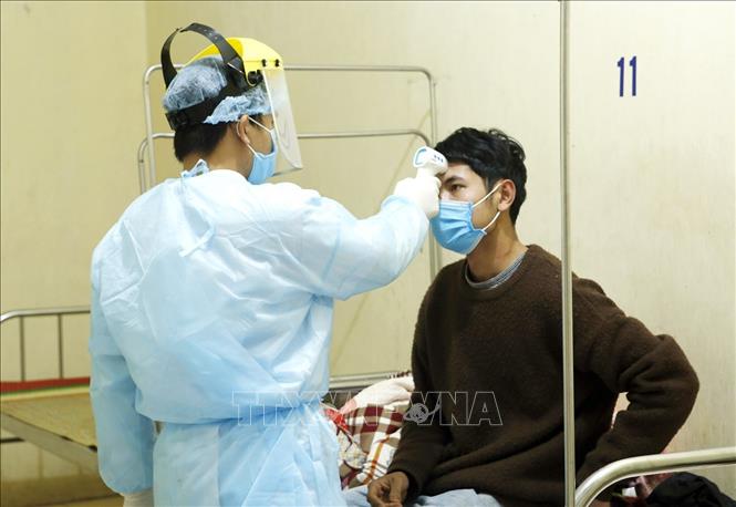 Nhân viên y tế kiểm tra thân nhiệt cho các ca bệnh đang được cách ly theo dõi nCoV tại Trung tâm Y tế huyện Bình Xuyên, Vĩnh Phúc (ảnh chụp chiều 7/2). Ảnh: Dương Ngọc/TTXVN