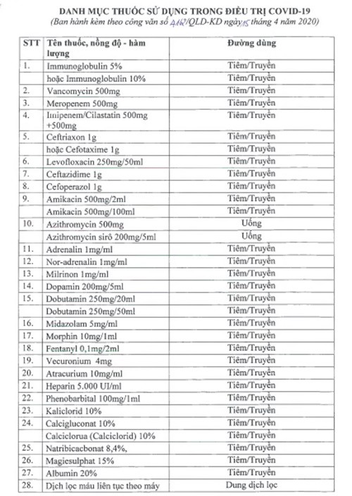 Danh mục thuốc sử dụng trong điều trị Covid-19 được xây dựng trên cơ sở Quyết định số 941/QĐ-BYT ngày 17/3/2020 của Bộ trưởng Bộ Y tế về việc ban hành danh mục trang thiết bị y tế, vật tư tiêu hao và thuốc thiết yếu của 1 khu vực điều trị cách ly người bệnh Covid-19 và Quyết định số 1344/QQĐ-BYT ngày 25/3/2020 của Bộ trưởng Bộ Y tế về việc ban hành chẩn đoán và điều trị viêm đường hô hấp cấp do SARS-CoV-2 (Covid-19).
