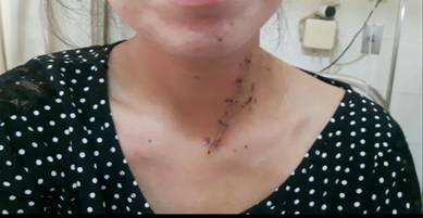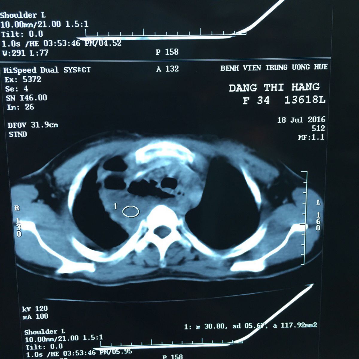 Ngày 19/7, bệnh nhân Đặng Thị H. 31 tuổi nhập viện. Bệnh nhân được chuyển đến từ Bệnh viện khu vực bắc Quảng Bình trong tình trạng cấp cứu suy hô hấp, nhiễm trùng nhiễm độc nặng, cổ bạnh ra do tràn khí nhiều dưới da. Bệnh nhân được làm các xét nghiệm khẩn như: XQ phổi, siêu âm, CT scan ngực… và được PGS.TS Phạm Như Hiệp (Phó GĐ BVTW Huế, Trưởng Khoa Ngoại nhi – Cấp cứu Bụng) thăm khám trực tiếp chẩn đoán: thủng thực quản cổ bên trái gây áp xe trung thất lan rộng sau hóc xương gà, tình trạng rất nặng có thể tử vong.