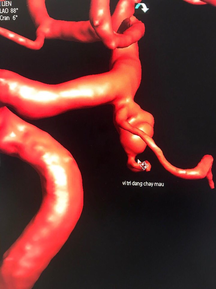 Ngay lập tức, bệnh nhân được vào Trung tâm Đột quỵ để được chụp mạch não và can thiệp cấp cứu. Kết quả, phát hiện bệnh nhân có một túi phình mạch não phía bên phải kích thước 5mm x3mm, động mạch phình uốn cong nhiều đoạn và đặc biệt nguy hiểm do túi phình đang chảy máu. Nhờ các bác sĩ khẩn trương thực hiện thủ thuật bít túi phình mạch não và cầm máu, bệnh nhân đã được cứu sống kịp thời. Sau 3 ngày can thiệp, bệnh nhân chỉ còn đau đầu nhẹ, hoàn toàn tỉnh táo, không có yếu liệt tay chân và chuẩn bị được cho xuất viện trong thời gian tới.