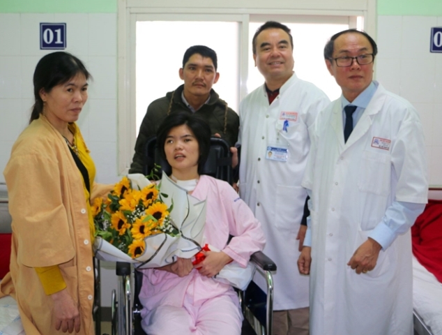 Bệnh nhân Trang xuất viện trong niềm vui của các bác sĩ BV Trung ương Huế và người thân gia đình. Ảnh: Nguyễn Tá Đông
