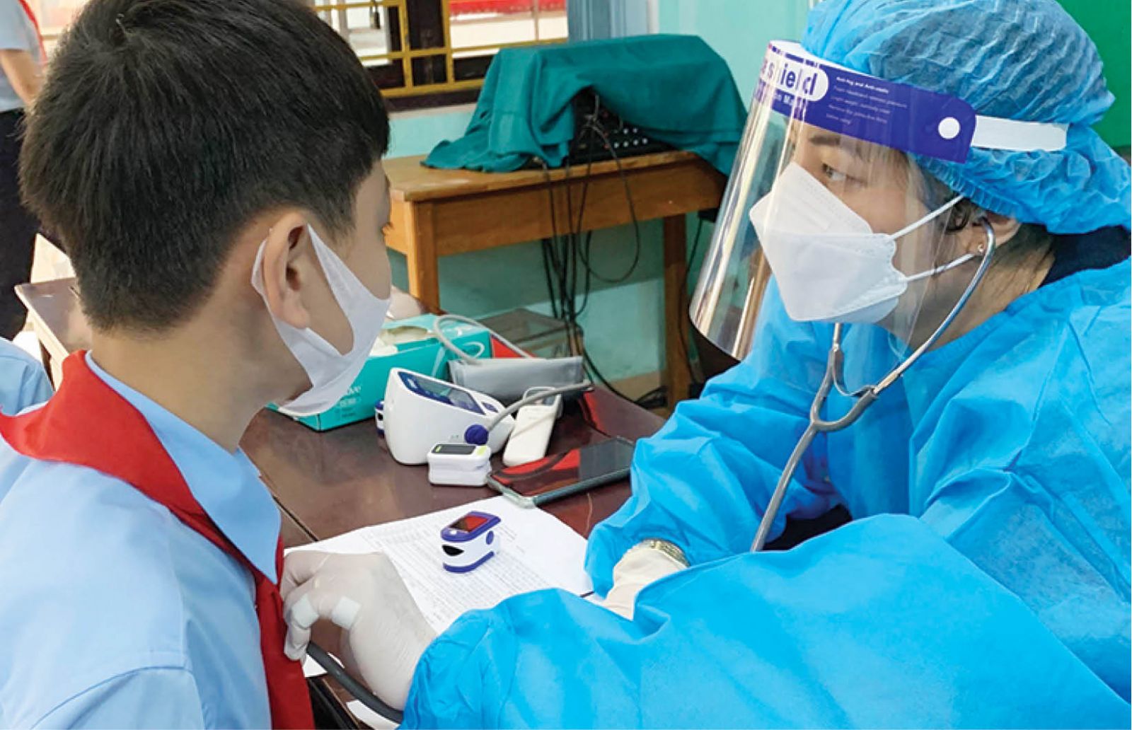 Khám sàng lọc cho học sinh Trường THCS Trần Cao Vân trước khi tiêm. Ảnh: MC