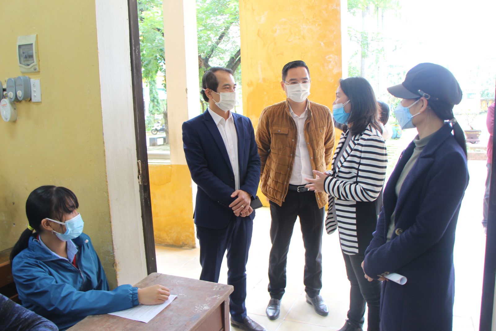 Chủ tịch UBND TP. Huế Võ Lê Nhật (ngoài cùng bên trái) kiểm tra công tác tiêm vắc - xin tại Trường THCS Nguyễn Chí Diểu