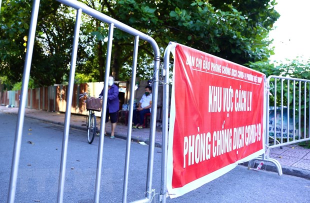 Phong tỏa tạm thời tổ 4, tổ 5 phường Việt Hưng (Hà Nội). (Ảnh: Hoàng Hiếu/TTXVN)