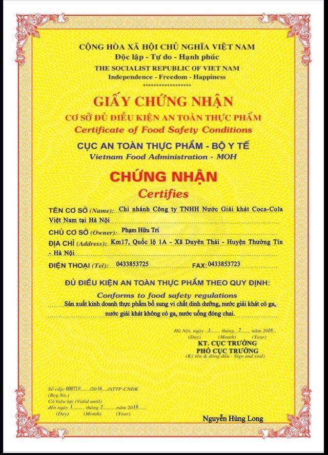 Giấy chứng nhận đủ điều kiện an toàn thực phẩm do Cục An toàn Thực phẩm cấp cho Coca Cola Việt Nam.