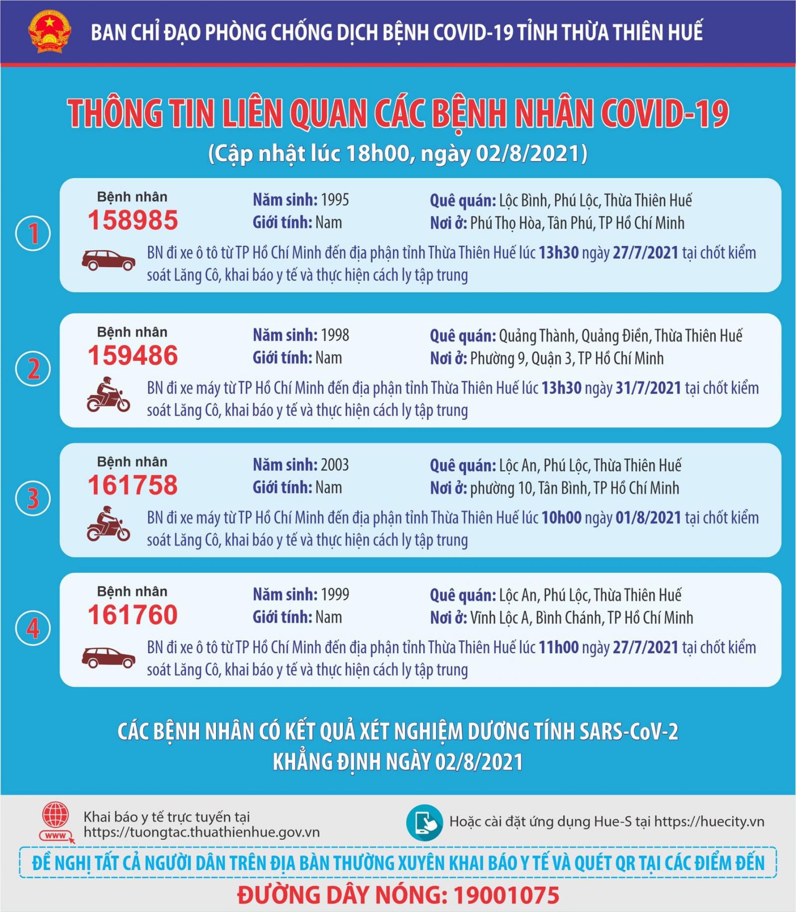 Bệnh nhân 159486, giới tính nam, sinh năm 1998; bệnh nhân 161758, giới tính nam, sinh năm 2003. Cả hai bệnh nhân đều đi xe máy từ TP. Hồ Chí Minh đến chốt kiểm soát Lăng Cô khai báo y tế và cách ly tập trung trong ngày 31/7 và 1/8.