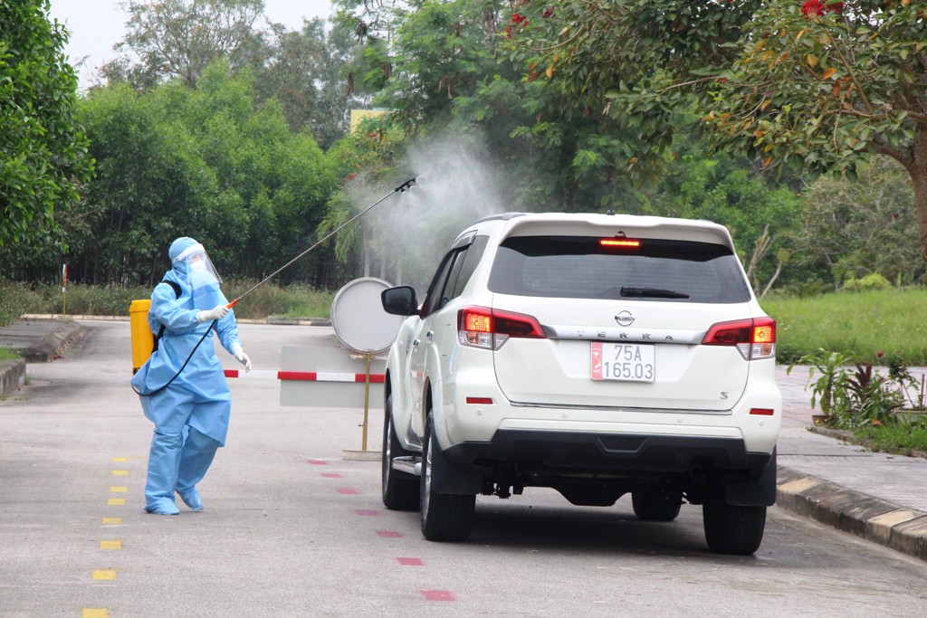 Chuyến xe di chuyển vô khu vực đón hai vị khách cách ly được phun thuốc tiêu độc, khử trùng