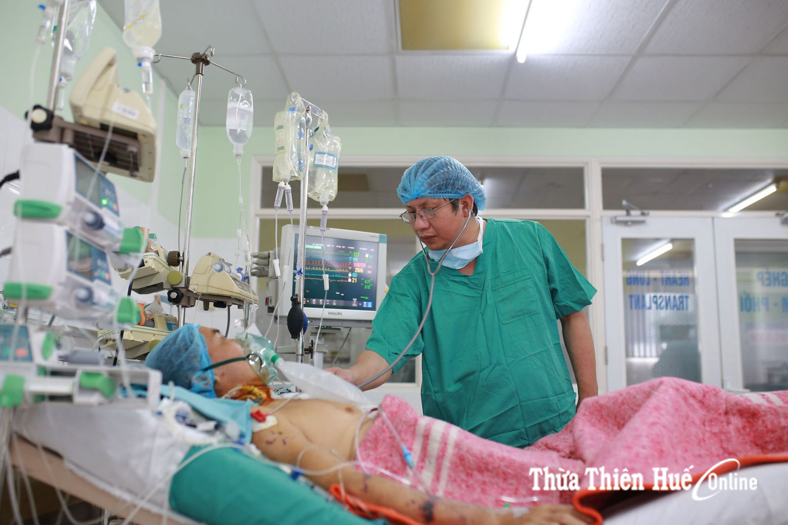 Bệnh nhân ghép tim được hồi sức ổn định huyết động và chuyển về phòng hồi sức tim lúc 17 giờ cùng ngày sau khi hoàn tất các công đoạn cuối cùng. Đây là ca ghép tim khó do thời gian vận chuyển quả tim từ Hà Nội về Huế đã mất hơn 3 tiếng đồng hồ. Bác sỹ Đặng Thế Uyên, trưởng khoa Gây Mê- Hồi sức Tim mạch đang kiểm tra tình trạng bệnh nhân sau ca ghép
