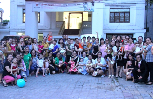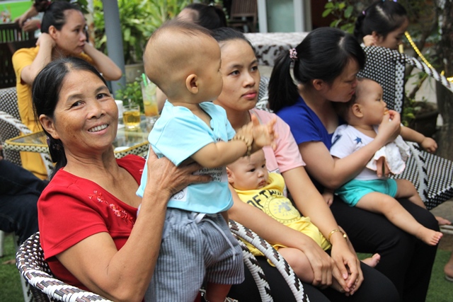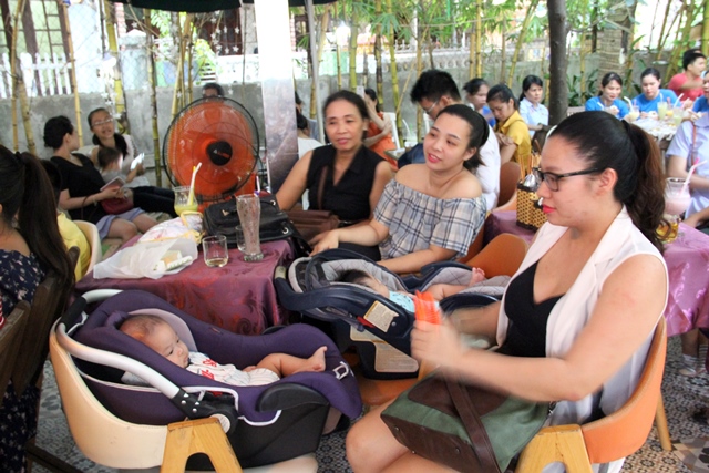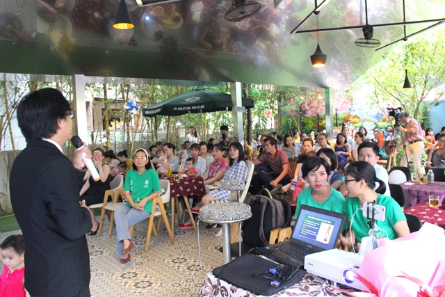 Các mẹ mang theo con nhỏ và người thân nghe diễn giả chia sẻ thông tin