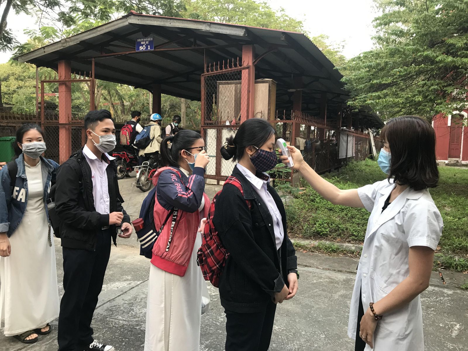 Học sinh Trường THPT Quốc Học kiểm tra thân nhiệt trước khi vào lớp .