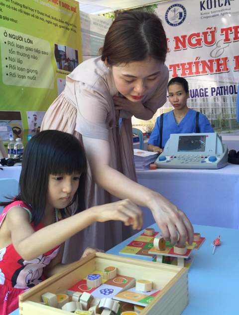Một em bé tham gia trò chơi luyện nói tại gian hàng âm ngữ trị liệu và thính học