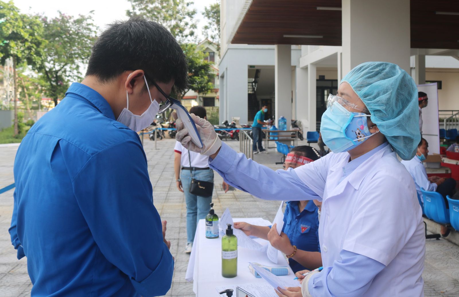 Đo thân nhiệt cho người tham gia hiến máu để đảm bảo phòng, chống dịch bệnh
