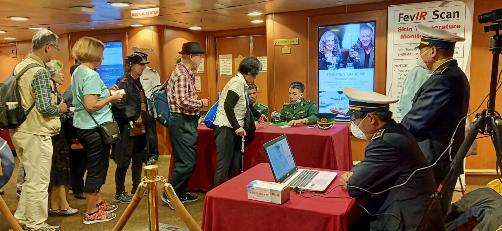 Sử dụng máy tầm soát thân nhiệt nhằm phát hiện các dấu hiệu bất thường trong phòng chống dịch do vi rút Corona trong quá trình làm thủ tục cho khách ở Cảng Chân Mây đầu năm mới. Ảnh: Lê Tiến