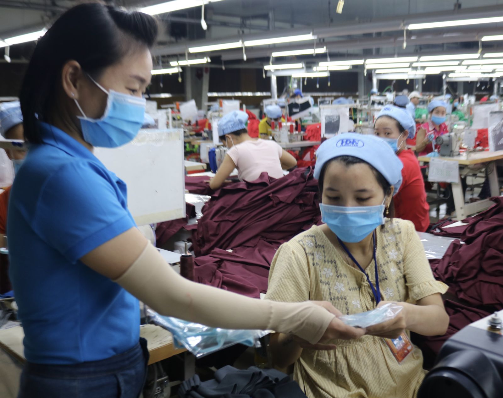 Cán bộ công đoàn công ty cấp phát khẩu trang cho người lao động