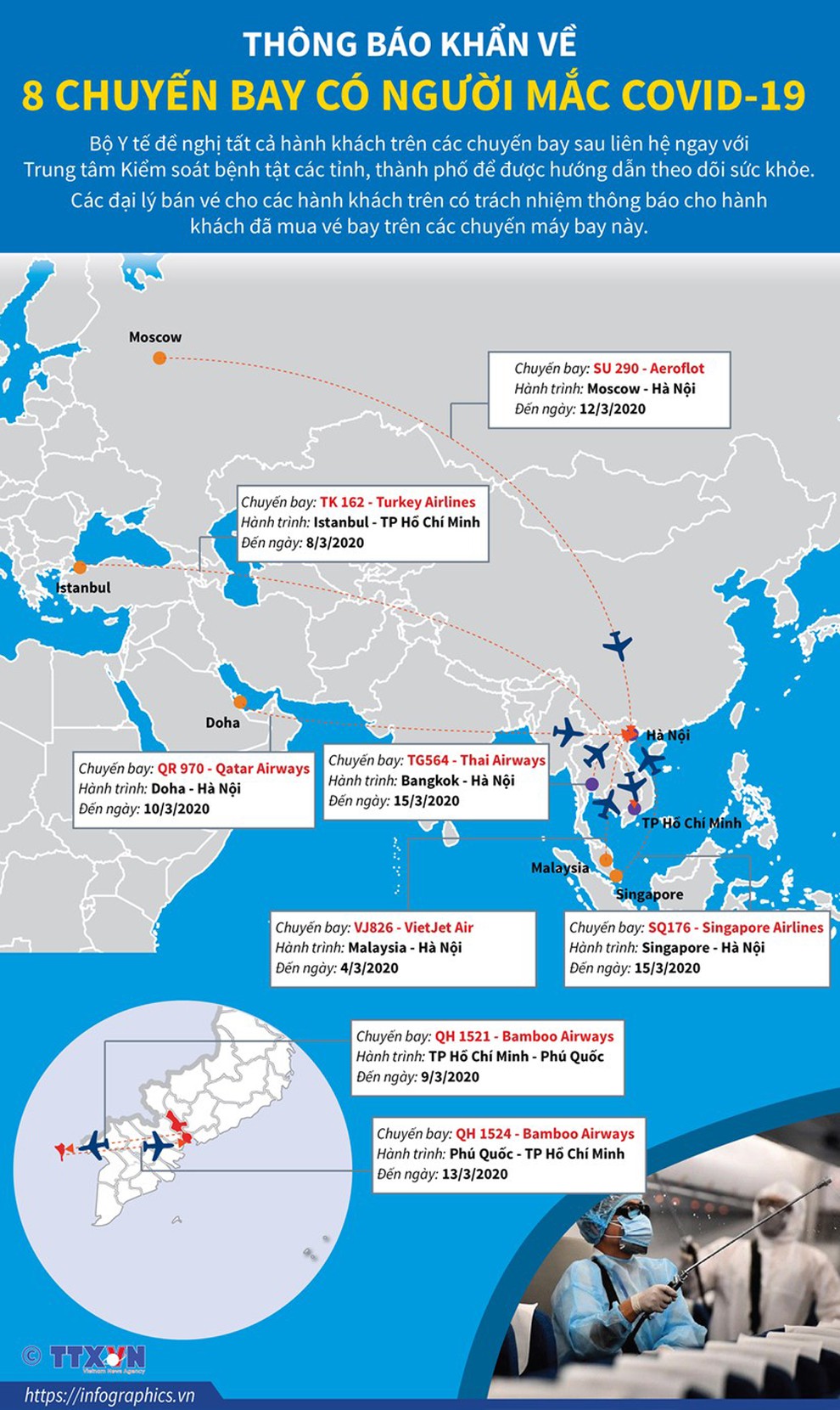 Infographics: Thông báo khẩn về 8 chuyến bay có người mắc Covid-19