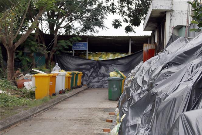 Chất thải y tế tồn đọng tại Bệnh viện đa khoa Cà Mau với khối lượng trên 10 tấn (Ảnh chụp tháng 11/2021). Ảnh: Kim Há/TTXVN.