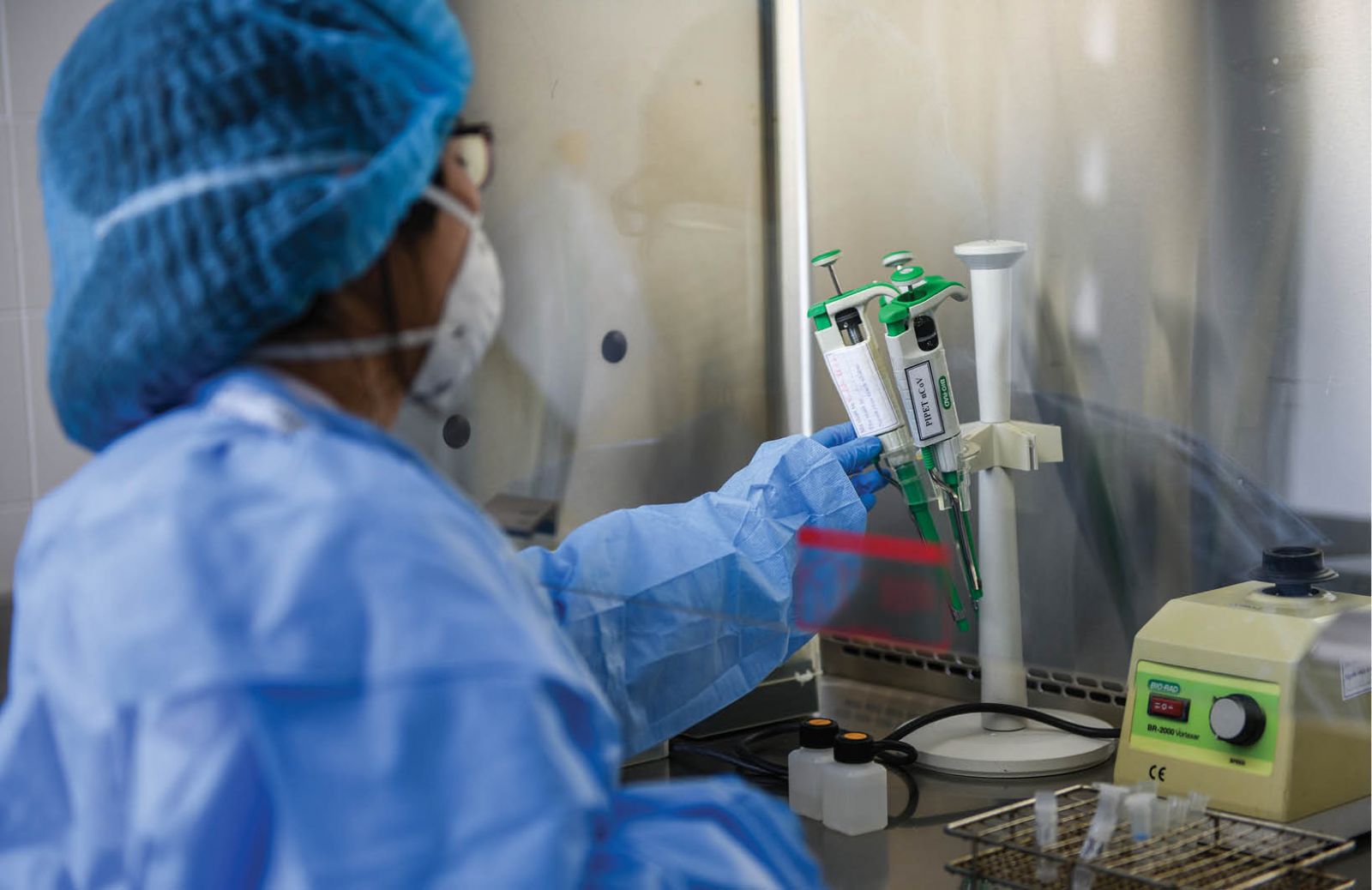 Tại khu xét nghiệm COVID-19 ở Bệnh viện Trung ương Huế, các kỹ thuật viên xét nghiệm các trường hợp nghi ngờ. Ảnh: Phan Thành
