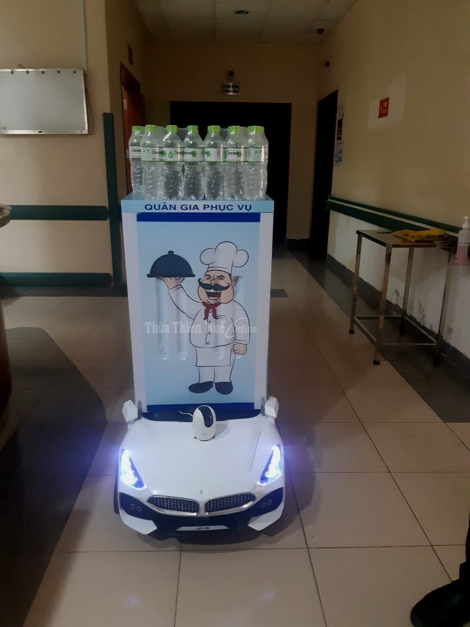 Rô bốt quản gia, sáng kiến của Th.S Huỳnh Phúc Minh, Phòng Quản lý buồng BV Trung ương Huế được đưa vào khu cách ly phục vụ cho công tác chống dịch COVID-19