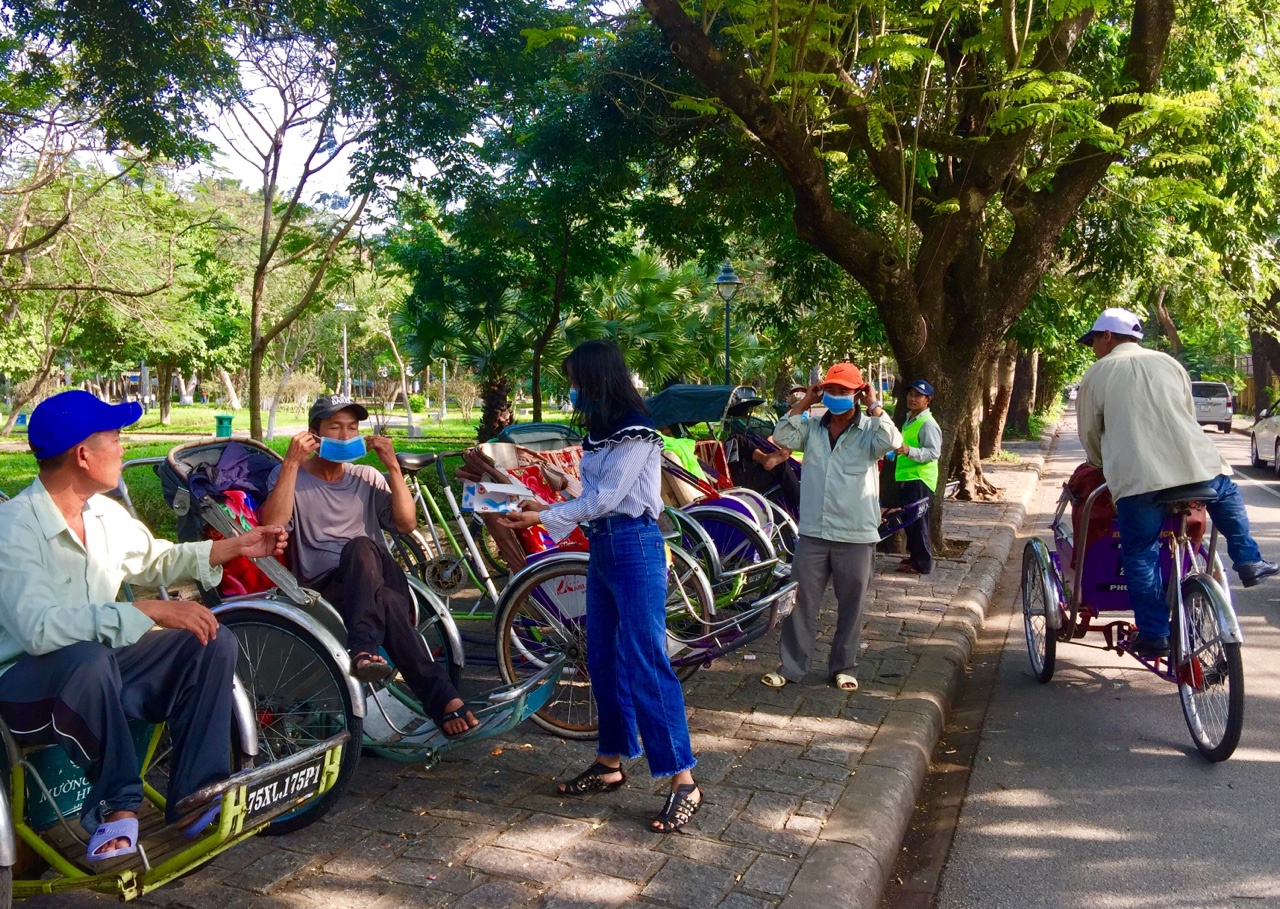 Không chỉ phát tại chỗ, chị Hiền - đại diện Mộc Truly Hue's còn đem khẩu trang tặng cho các nhóm xích lô ở các đường lân cận