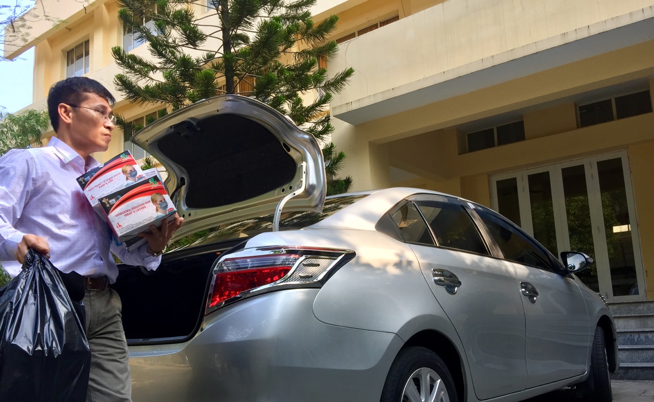 Thầy Trương Thế Quy chuyển 1.000 khẩu trang gom được vào văn phòng đợi phát cho sinh viên sáng 1/2