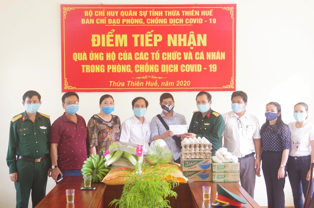 Những phần quà thiết thực từ: Hội doanh nhân trẻ Thừa Thiên Huế ủng hộ 7.200 lon nước giải khát, 1.000 khẩu trang vải, 1.000 hộp trà lọc trị giá trên 150 triệu đồng; Công ty TNHH Long Phụng và Cấp ủy, chính quyền, bà con Nhân dân xã Lộc Bổn, huyện Phú Lộc ủng hộ 955 kg rau, cũ, quả, 21 thùng mỳ tôm, 5 tấn gạo, 50 triệu đồng tiền mặt và một số nhu yếu phẩm khác và nhiều cơ quan, đoàn thể, doanh nghệp, tổ chức, cá nhân đã đến tại điểm tiếp nhận quà ủng hộ phòng, chống dịch COVID-19 của Bộ CHQS tỉnh để gửi gắm tấm lòng của mình đến người dân đang cách ly và cán bộ, chiến sĩ.