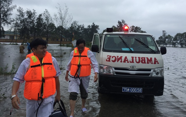 Chiều 7/11, bác sĩ Nguyễn Thị Thêm, Trạm trưởng Y tế Vinh Thái (huyện Phú Vang) cho biết, toàn xã có 8 thôn thì có 4 thôn bị ngập trong nước. Trạm chỉ có 6 cán bộ chia trực tại các thôn ngập nước; đồng thời huy động thêm cán bộ y tế thôn cấp phát thuốc cho người huyết áp cao, đau bụng…