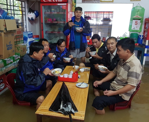 Cán bộ TTYT Hương Trà ứng trực phải ăn cơm khi nước dâng cao vào chiều 5/11