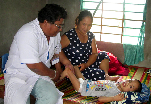 Cháu Trần Mạnh, sinh năm 2010, con trai chị Ngô Thị Lành bị bại não bẩm sinh, hoàn toàn không có ý thức. Hàng tháng, mỗi tuần một lần cán bộ y tế phối hợp với cộng tác viên tại thôn đến khám, vật lý trị liệu và hướng dẫn người nhà tập luyện giúp cháu không chỉ duy trì sức khỏe tốt mà còn thể hiện được một vài hoạt động có ý thức.