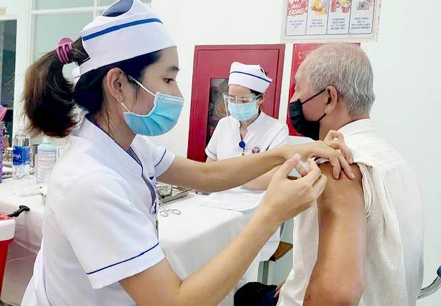 Tiêm vắc-xin phòng COVID-19 cho cán bộ hưu trí và người trên 65 tuổi tại BV Đại học Y - Dược Ảnh: Khoa Hùng
