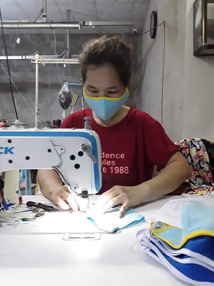 Nhân công ở cơ sở may Phương Nhi may khẩu trang vải tặng lực lượng chống dịch