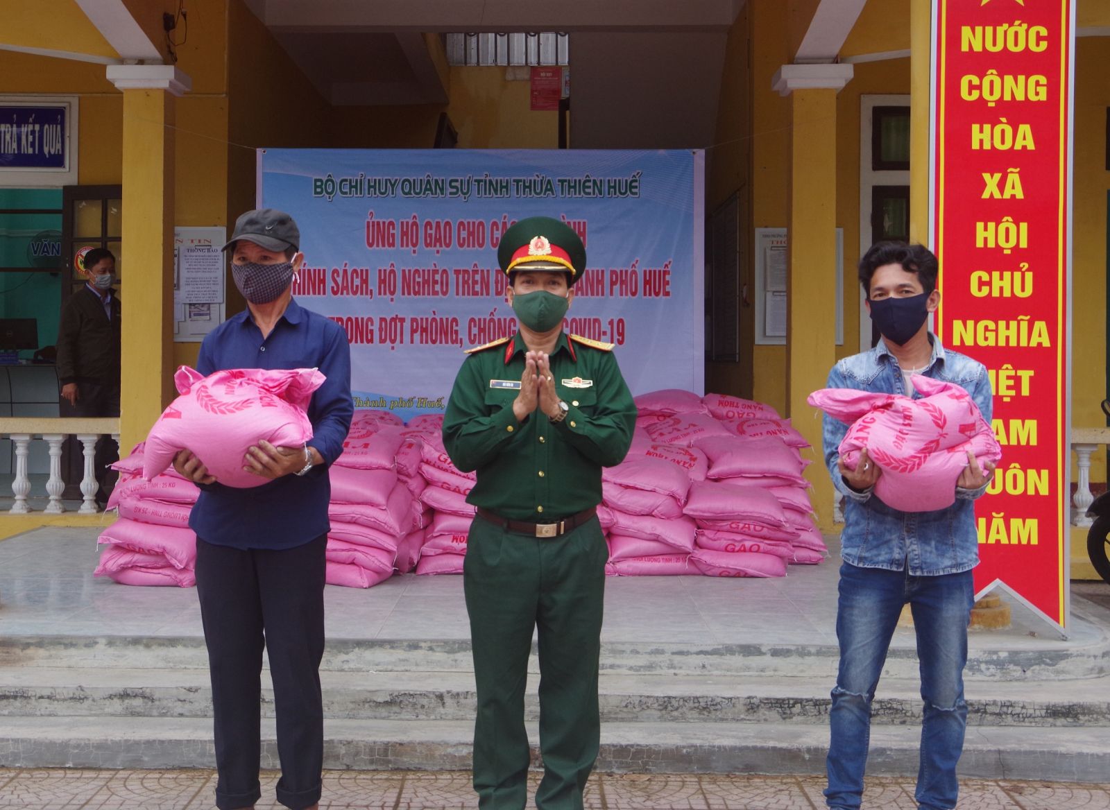 Thượng tá Hà Văn Ái – Phó Chính ủy Bộ CHQS tỉnh trao gạo cho đại diện các hộ nghèo trên địa bàn thành phố Huế