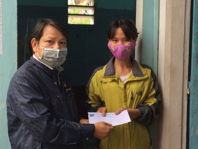 Nhà văn Hồ Đăng Thanh Ngọc - Chủ tịch Liên hiệp các Hội Văn học nghệ thuật trao quà cho người lao động bị ảnh hưởng do dịch COVID-19