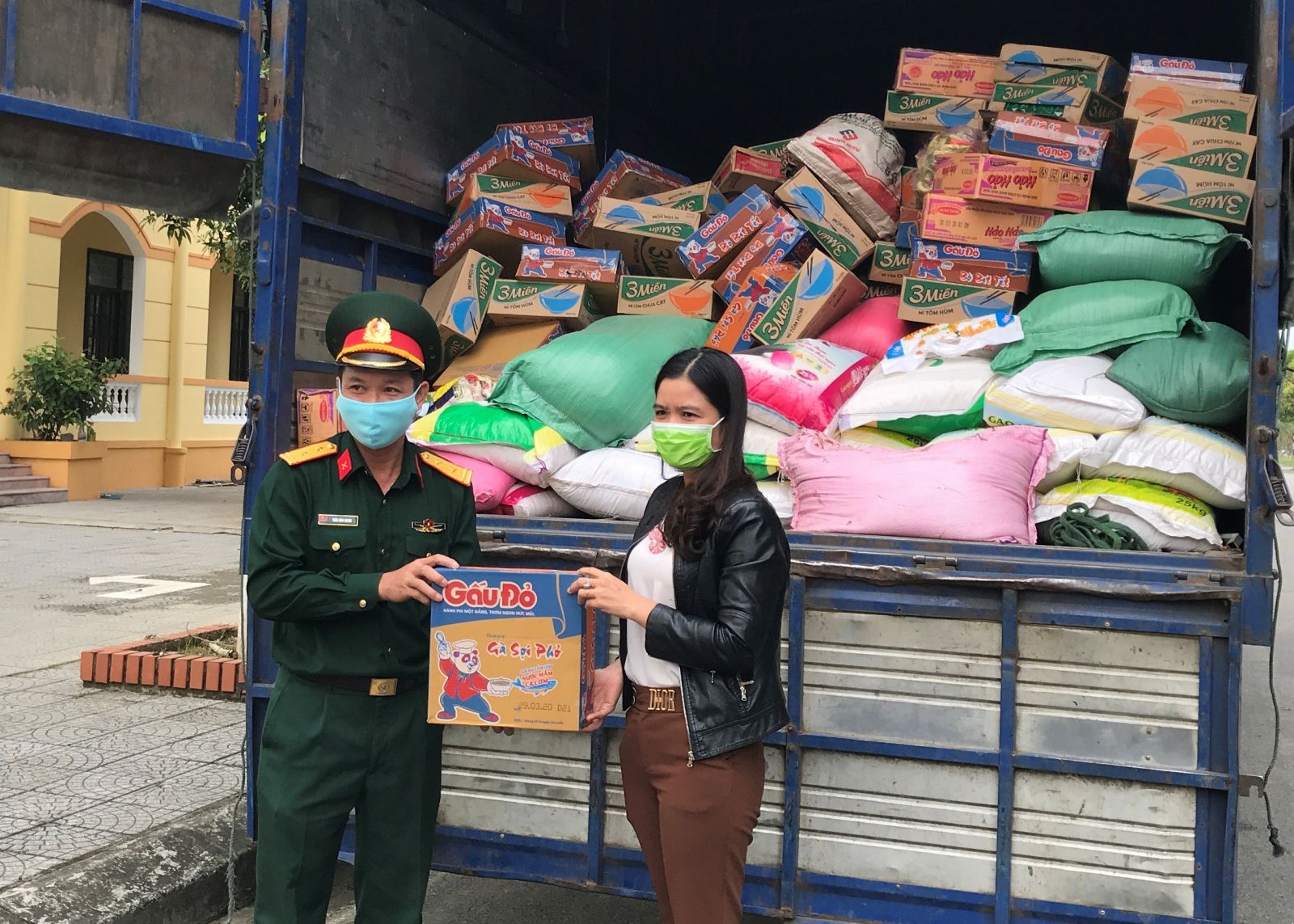 Xe hàng bao gồm hơn 1,5 tấn gạo, 142 thùng mì tôm, 6 tấn rau, củ, quả và các loại thực phẩm khác có giá trị gần 100 triệu đồng được đưa đến điểm tiếp nhận quà ủng hộ phòng, chống dịch COVID - 19 tại Bộ CHQS tỉnh.