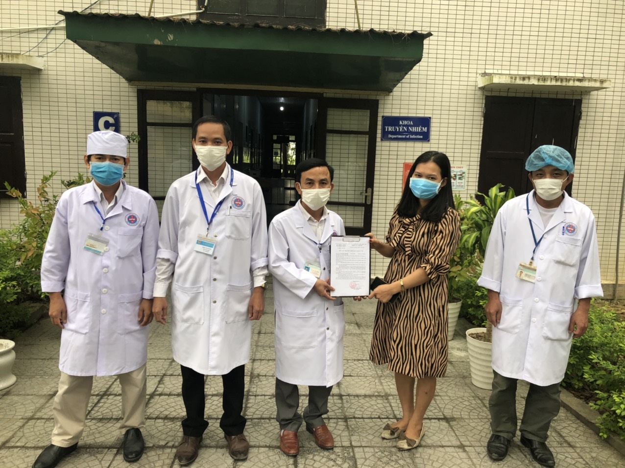 Trao giấy chứng nhận hoàn thành cách ly cho trường hợp F1 thứ 2 tại Trung tâm Y tế thị xã Hương Trà chiều 6/4