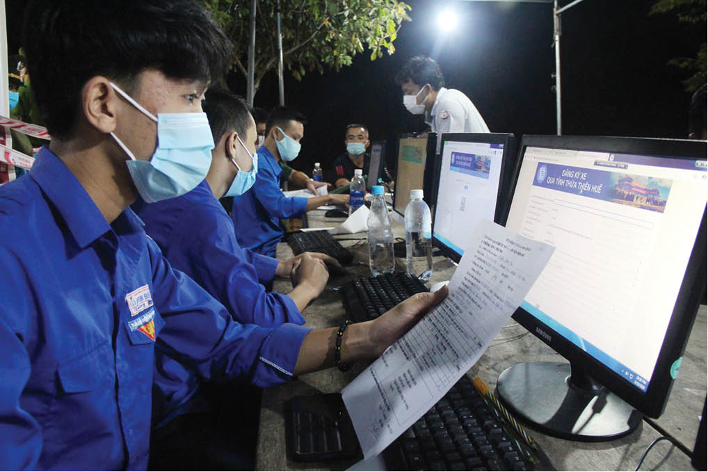 Khuya ngày 16, rạng sáng 17/8, từng đoàn xe tải, ô tô khách dồn dập nối đuôi nhau từ địa phận Quảng Trị vào Huế. Tất cả các phương tiện buộc phải dừng để khai báo theo quy định trước khi tiếp tục di chuyển. Đó cũng là thời điểm các bạn trẻ phải làm việc liên tục, với tần suất cao, đảm bảo nhanh chóng nhưng chặt chẽ quy trình.