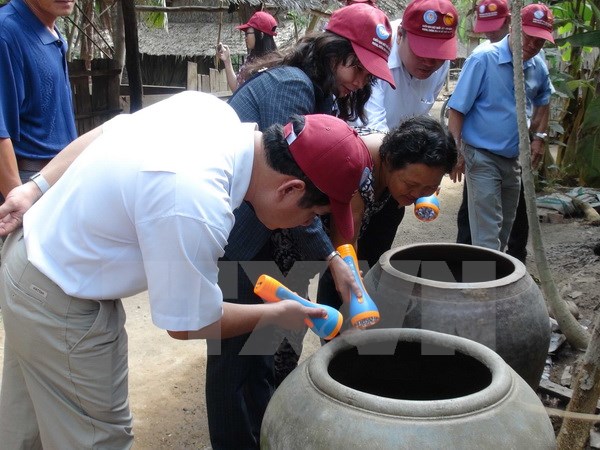 Khảo sát và hướng dẫn người dân diệt muỗi, loăng quăng đúng cách. (Ảnh: Thanh Hòa/TTXVN)