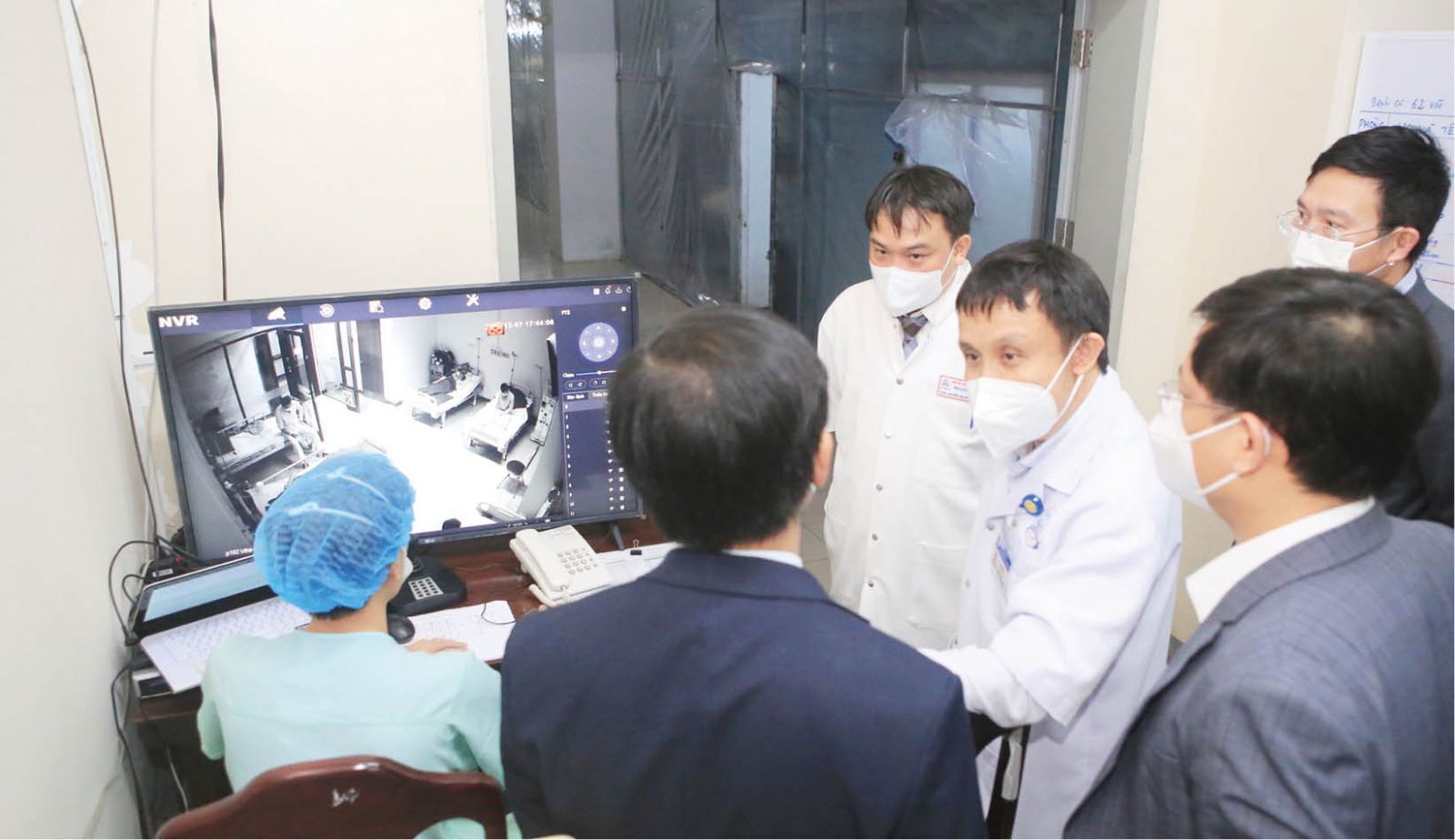 GS.TS Phạm Như Hiệp giới thiệu với lãnh đạo tỉnh về hệ thống theo dõi bệnh nhân qua camera. Ảnh: Bệnh viện cung cấp