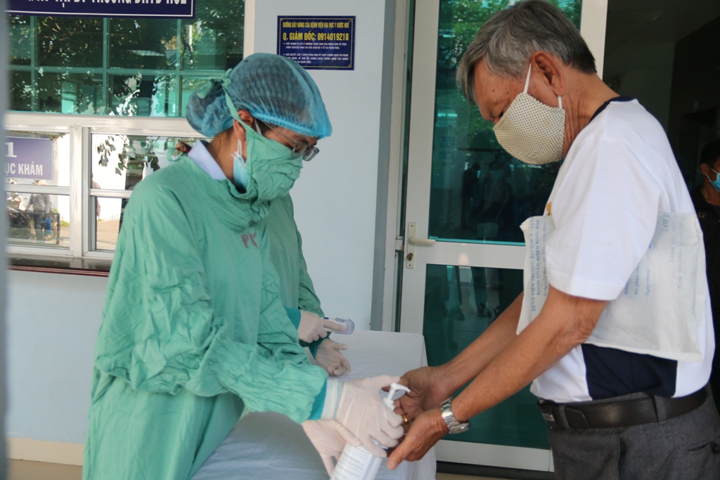 Cán bộ y tế ở Bệnh viện Trường ĐH Y dược Huế giúp người dân sử dụng dung dịch sát khuẩn