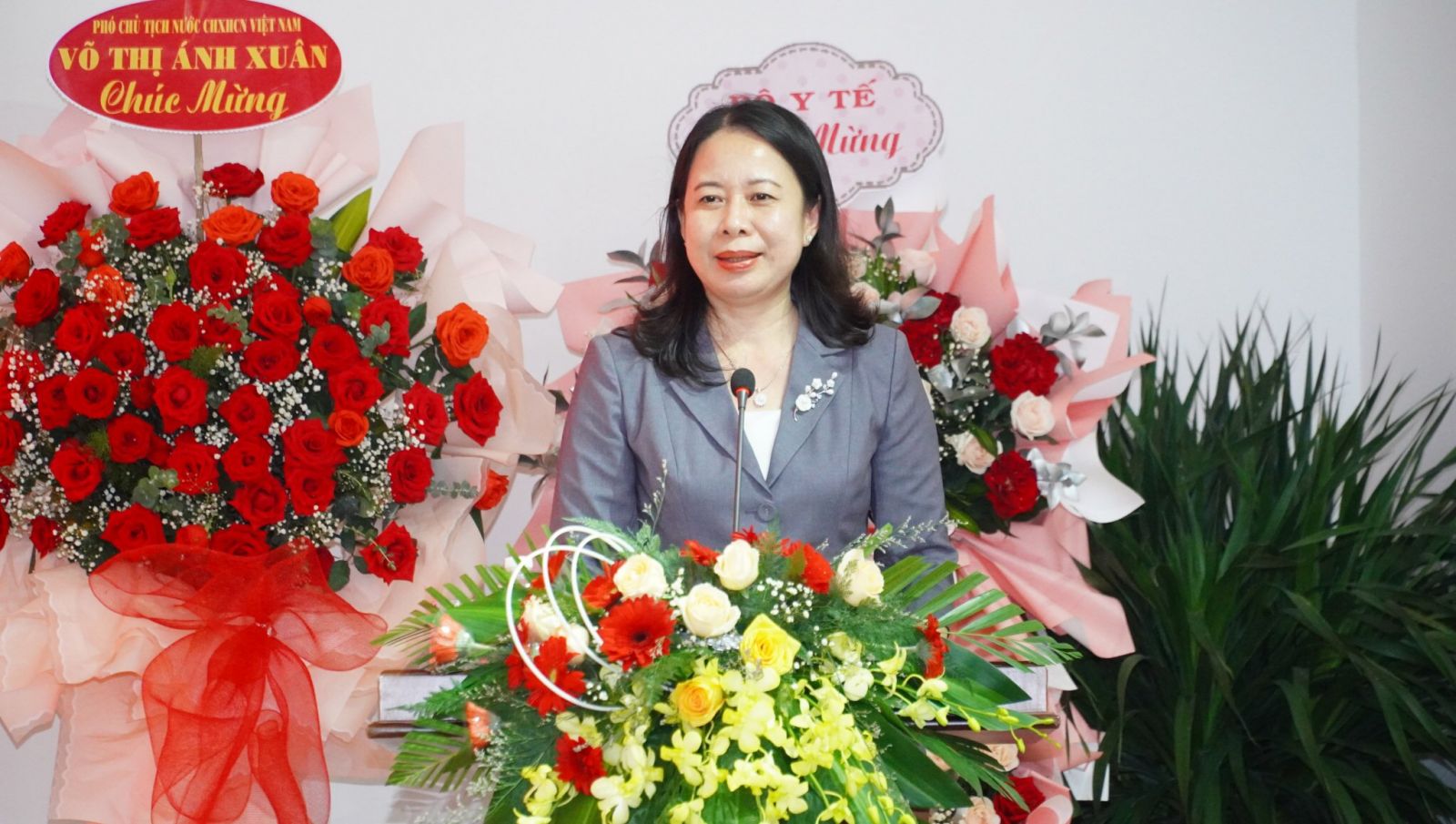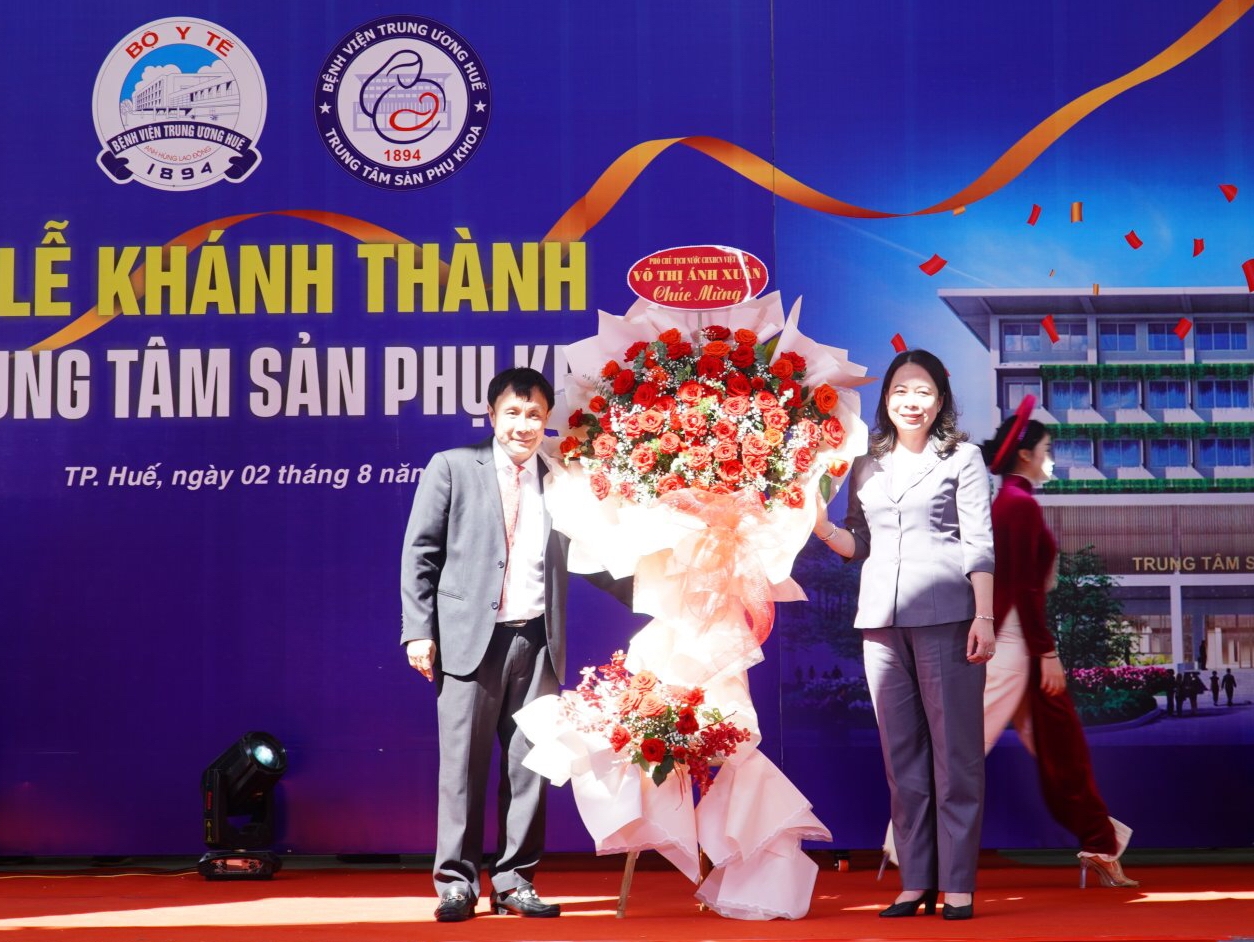 Phó Chủ tịch nước Võ Thị Ánh Xuân tặng hoa chúc mừng khánh thành Trung tâm Sản Phụ khoa Bệnh viện Trung ương Huế