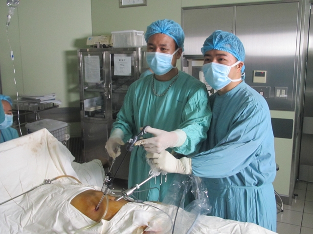 Tiếp đó, bệnh nhân được chỉ định phẫu thuật nội soi lấy dị vật. Ngày 13/6, êkip phẫu thuật do Th.s, BS Phạm Xuân Đông hướng dẫn thực hiện và ê kíp gây mê của BS Nguyễn Trung Hậu tiến hành phẫu thuật hoàn toàn nội soi qua ổ bụng, lấy dị vật cho bệnh nhân.