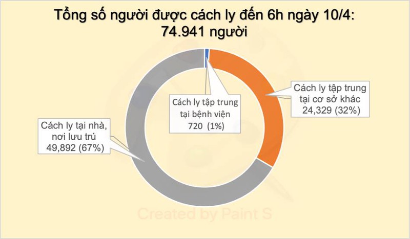 Tổng số người tiếp xúc gần và nhập cảnh từ vùng dịch đang được theo dõi sức khỏe (cách ly) trên cả nước là 74.941 người. Trong đó, cách ly tập trung tại bệnh viện: 720 người; cách ly tập trung tại cơ sở khác: 24.329 người và cách ly tại nhà, nơi lưu trú là 49.892 người.
