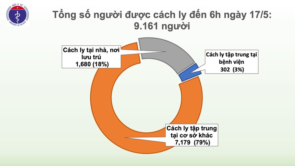 Số người cách ly: Tính đến 6h ngày 17/5, tổng số người tiếp xúc gần và nhập cảnh từ vùng dịch đang được theo dõi sức khỏe (cách ly) là 9.161, trong đó: