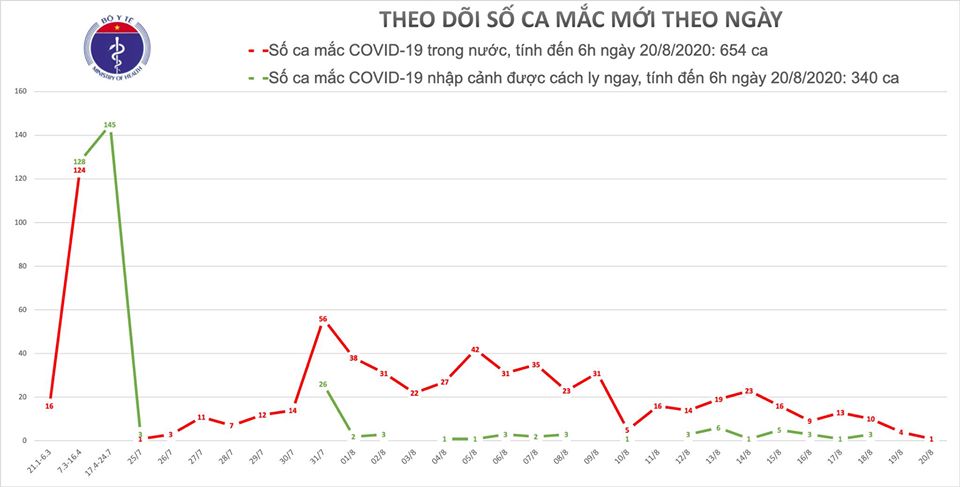 Tính đến 6h ngày 20/8, Việt Nam đã ghi nhận tổng số 994 ca mắc COVID-19. Trong đó có 654 ca mắc COVID-19 do lây nhiễm trong nước, số lượng ca mắc mới liên quan đến Đà Nẵng tính từ ngày 25/7 đến nay là 514 ca.