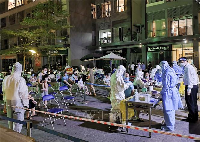 Lấy mẫu xét nghiệm COVID-19 cho cư dân tòa Park 11 - Times City trong đêm 26/5. Ảnh: TTXVN