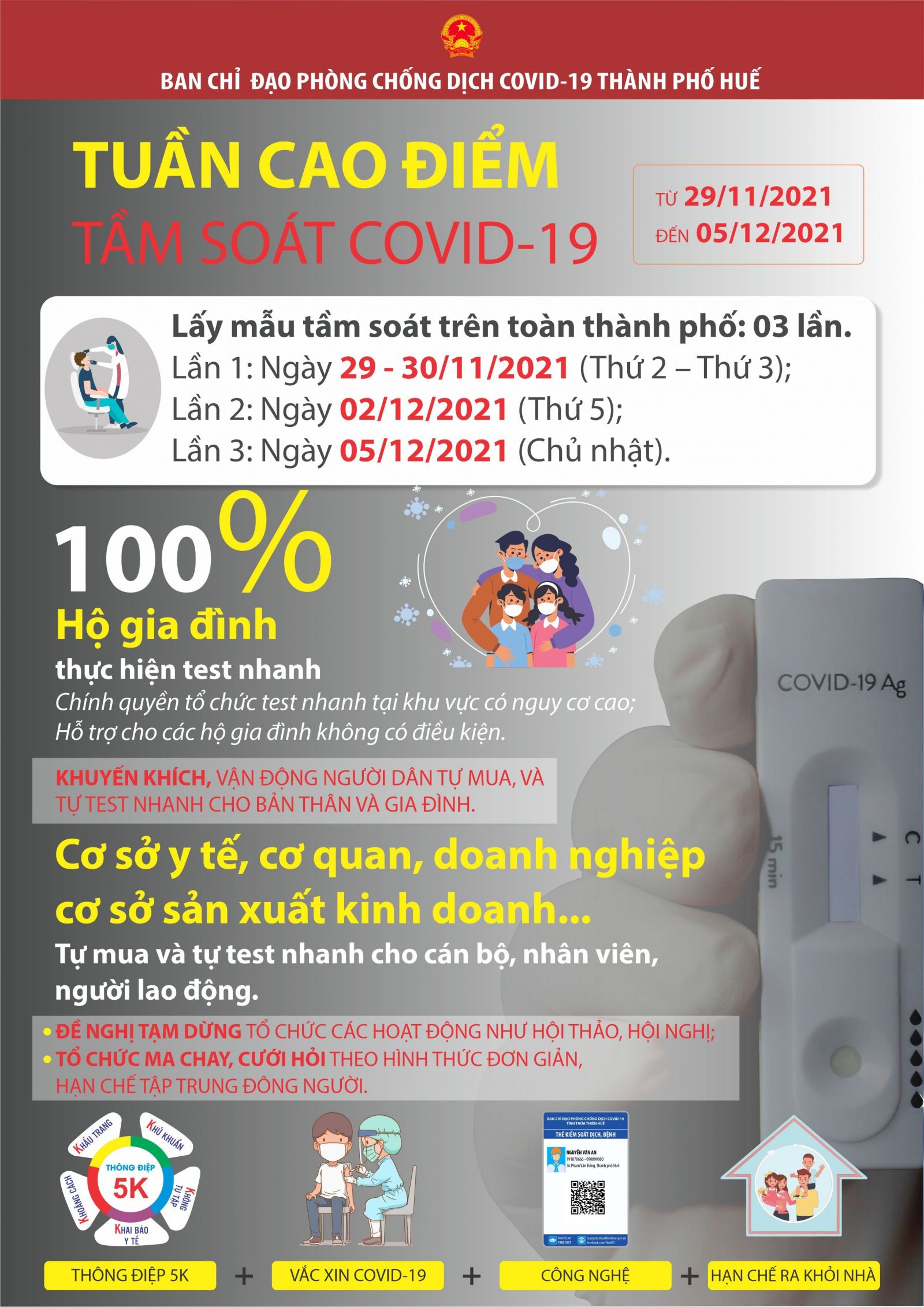 Theo đó, các hoạt động chủ yếu của Tuần cao điểm tầm soát COVID- 19, bao gồm: triển khai xét nghiệm sàng lọc bằng test nhanh kháng nguyên tại địa bàn khu dân cư, trong đó số lần lấy mẫu chung trên toàn thành phố là 3 lần, lần 1 từ ngày 29 - 30/11; lần 2 ngày 2/12; lần 3 ngày 5/12. Tuần cao điểm triển khai tại 9 phường/xã: An Cựu, An Hòa, Hương Sơ, Phú Hậu, Tây Lộc, Thuận Hòa, Thuận Lộc, Phú Dương, Phú Mậu. Trong đó, đối với vùng đỏ (khu vực có nguy cơ cao): Trung tâm Y tế TP. Huế xây dựng kế hoạch triển khai tầm soát; đối với những khu vực còn lại (ngoài vùng đỏ): BCĐ phòng chống dịch các phường, xã phối hợp Trung tâm Y tế thành phố thực hiện tầm soát diện rộng cho toàn bộ người dân còn lại của 9 phường/xã nêu trên. Dự kiến, sử dụng khoảng 32.000 test nhanh kháng nguyên.