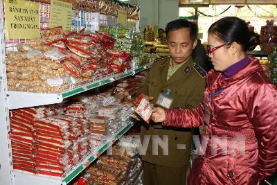 Đoàn thanh tra liên ngành kiểm tra nhãn mác hàng hóa tại một siêu thị ở thành phố Sơn La. Ảnh: Trần Việt/TTXVN