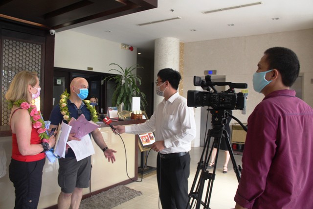 Phóng viên Báo Thừa Thiên Huế phỏng vấn các du khách nước ngoài hoàn thành cách ly