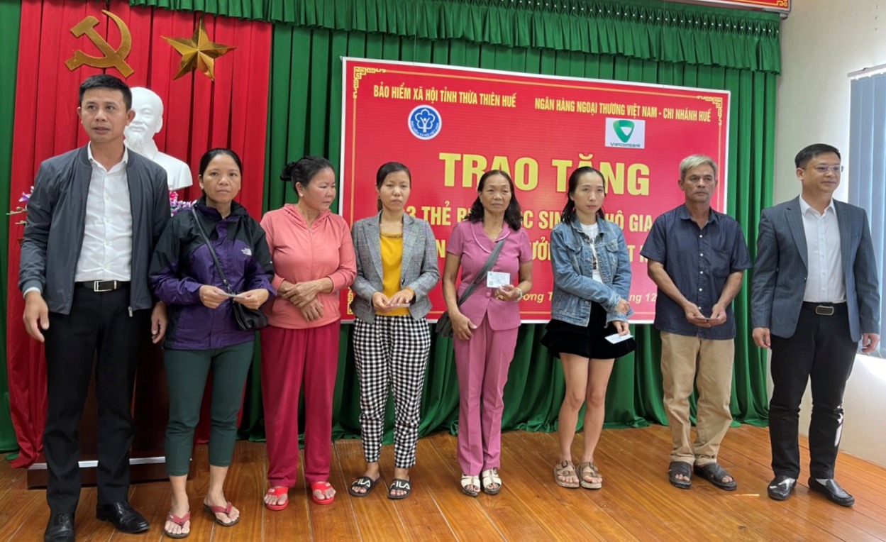 HNN.VN - Chiều 29/12, Bảo hiểm xã hội (BHXH) tỉnh phối hợp với Ngân hàng TMCP Ngoại thương Việt Nam Vietcombank (Chi nhánh Thừa Thiên Huế) trao tặng hơn 300 thẻ Bảo hiểm Y tế (BHYT) cho người dân bị ảnh hưởng bởi thiên tai, bão lũ tại các xã, phường vùng thấp trũng trên địa bàn TX. Hương Trà.