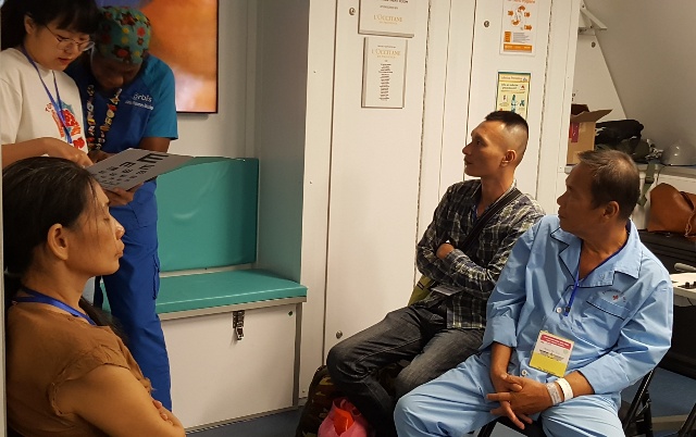 Chờ đến lượt mình ngoài phòng khám, ông L.V.H (gần 70 tuổi, TP. Huế) chia sẻ, cả hai mắt của ông bị mờ dần từ nhiều năm nay nên sinh hoạt, ăn uống khó khăn. Nay, ông H. may mắn được BV Bay Orbis lựa chọn trong số bệnh nhân đang khám điều trị tại BV Mắt Huế để phẫu thuật trên máy bay đợt này. “Hy vọng qua lần phẫu thuật của các chuyên gia nước ngoài, mắt tôi sẽ trở lại bình thường”, ông H. nói.